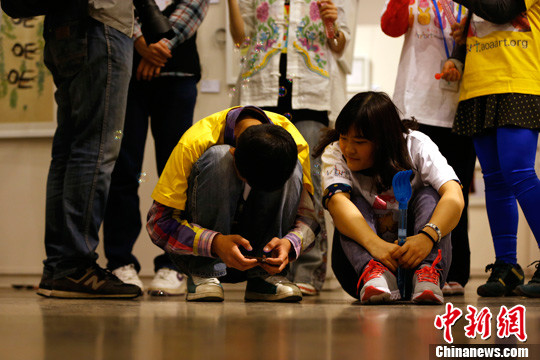 图为志愿者在陪伴一名孤独症儿童绘画者看手机。中新社发 富田 摄