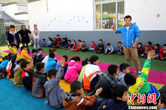 图为4月2日,陕西,志愿者们和小学生做心理健康小游戏。 杨宁 摄
