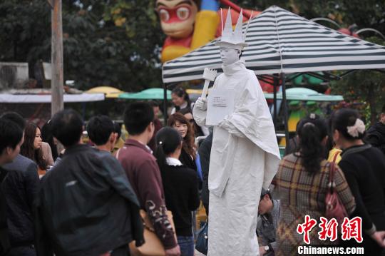 4月2日,“自由男神”活体雕塑亮相重庆洋人街,吸引不少游客簇拥围观。陈超 摄