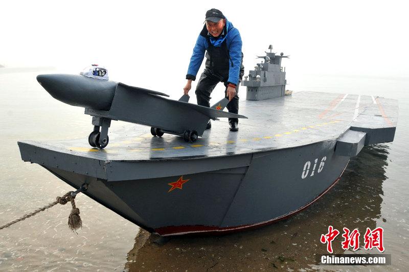 4月2日,山东青岛,在汇泉湾一侧海滩上,80岁高龄老人温玉著手工制作的一艘按1:25比例的“辽宁舰”已“列装”舰载机。据了解,老人制作航母的初衷仅仅是因为外孙的一句话,使这位与大海打交道多年的老人萌生出建造航母的灵感,耗时一个多月,一艘青岛版的“辽宁舰”基本完工。接下来将给“辽宁号”安装动力系统和雷达设施,就可以在海上航行了。赵健鹏 摄