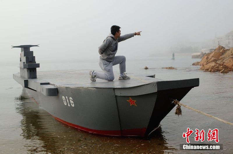 4月2日,山东青岛,在汇泉湾一侧海滩上,80岁高龄老人温玉著手工制作的一艘按1:25比例的“辽宁舰”已“列装”舰载机。据了解,老人制作航母的初衷仅仅是因为外孙的一句话,使这位与大海打交道多年的老人萌生出建造航母的灵感,耗时一个多月,一艘青岛版的“辽宁舰”基本完工。接下来将给“辽宁号”安装动力系统和雷达设施,就可以在海上航行了。赵健鹏 摄