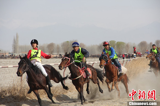 4月3日,地处新疆天山南麓的博湖县举办第四届“博斯腾杯”赛马大会,来自新疆各地州市的19支队伍,近百匹纯血马、混血马以及博湖县地产马参加此次大赛,其中最远的队伍来自和田和伊犁。图为赛马现场。袁晶 摄