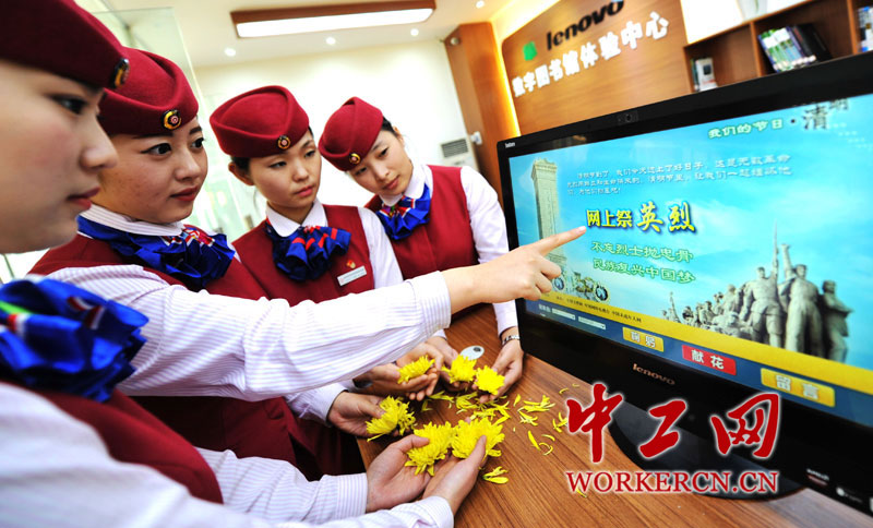 4月3日,南昌客运段动姐们来到江西省图书馆,参加“赣南苏区百万群众缅怀革命先烈清明网上祭奠活动”。她们献上鲜花点击鼠标用独特的方式,表达对革命先烈的敬爱。周帆说:通过网上文明祭奠,既环保又庄重,在实现社会核心价值观进程中,扎实工作,为梦想而奋斗!鲍赣生 摄