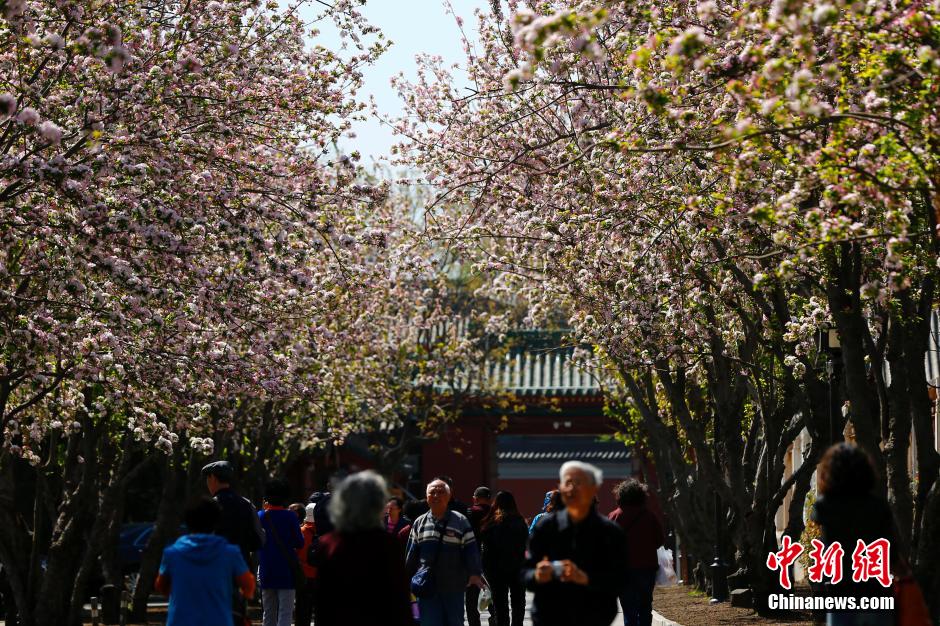 4月3日,随着北京天气逐步升温,北海公园西门内的21棵西府海棠盛开迎春,民众赏花踏春。中新社发 富田 摄