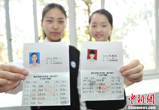 4月3日,重庆渝北两江中学学生校内建“善行银行”,银行工作人员由学生组成。图为银行工作人员正在展示“善行银行”模拟银行卡。中新社发 陈超 摄