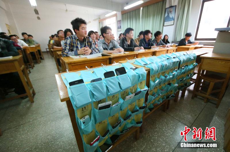 4月03日,在洛阳理工学院工程管理系教室,学生们自愿将手机放入贴有自己姓名的手机收纳袋中。图片来源:CFP视觉中国