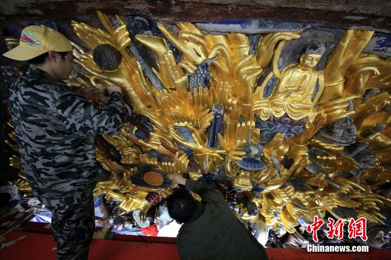 4月3日,重庆市大足区宝顶山千手观音抢救性修复工程现场,工作人员正在进行贴金修复。截至当天,已初步完成230只手的贴金修复,预计整个修复工程将于2015年上半年完成。