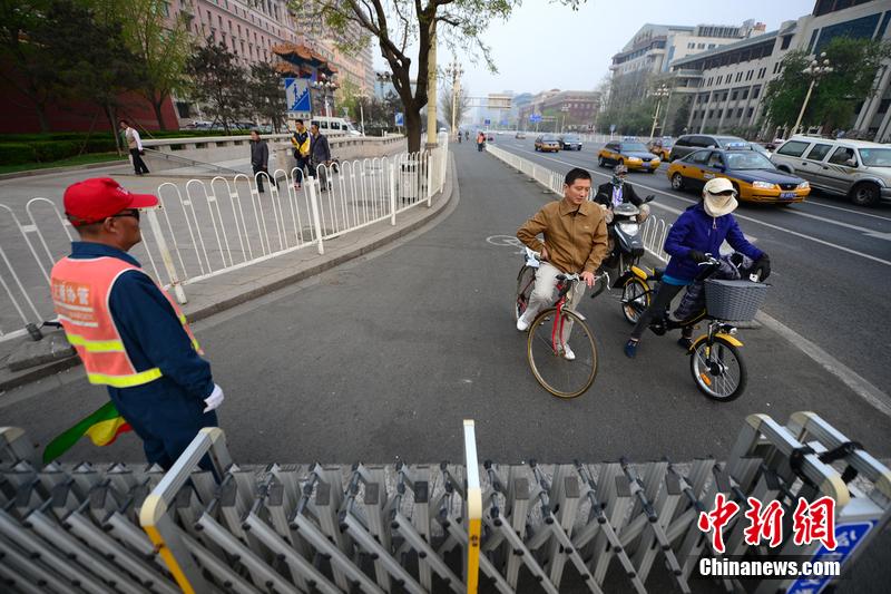 2014年4月2日,北京长安街上多个路口增设了封机动车护栏,红灯时非机动车护栏拉起,防止非机动车闯红灯。图为红灯亮起,协管员把护栏拉开防止非机动车闯红灯。