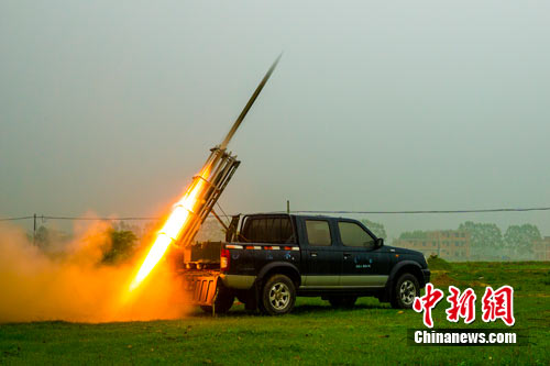 图为4月7日,广西钦州市钦南区尖山镇西沟村,一枚人工增雨火箭弹射向预定空域。中新社发 李斌喜 摄