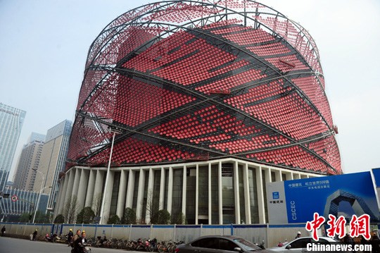 4月8日,湖北武汉武昌水果湖畔的汉秀剧场“红灯笼”外立面建成完工,内部整修尚在进行中。中新社发 张畅 摄