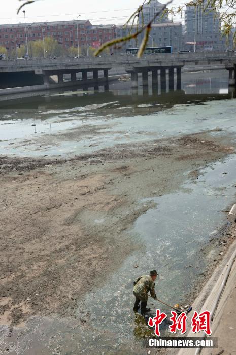4月8日,内蒙古呼和浩特河道内,工人在清理垃圾。由于气温回升,河道周边可闻到散发的臭味,相关部门已开始治理。中新社发 刘文华 摄