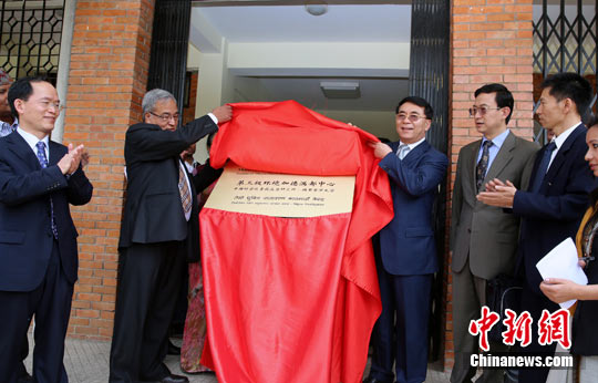 图为4月7日,中国科学院院长白春礼与尼泊尔特里布文大学副校长马哈瑞坚共同为新机构揭牌。中新社发 符永康 摄