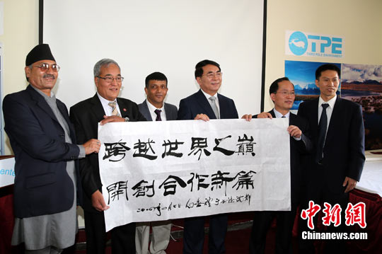 图为4月7日中国科学院院长白春礼(右三)为新机构题写“跨越世界之巅,开创合作新篇”。中新社发 符永康 摄