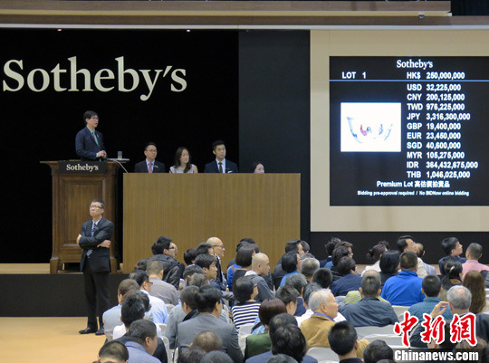 图为落槌前一幕,全场等待上海收藏家刘益谦通过电话代理人确认。中新社发 贾思玉 摄