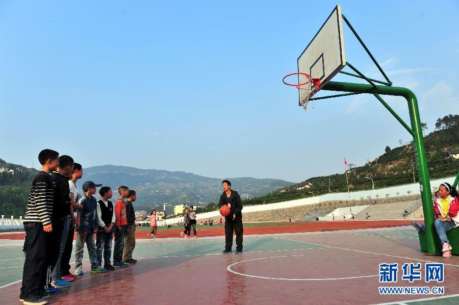 4月8日,在两河口镇中心小学塑胶操场上,老师在教学生打篮球。位于三峡库区的湖北省秭归县两河口镇中心小学是一所农村乡镇小学,现有学生730多人,教职工50多名。为让大山里的孩子们享受更好的教育条件,湖北省秭归县教育局为该校投资新建起一所包含塑胶操场、微机室、图书室、阅览室、多媒体教室、电子备课室等现代化教学设施的新校舍,新校舍于2013年9月建成投入使用。新华社发(王辉富 摄)