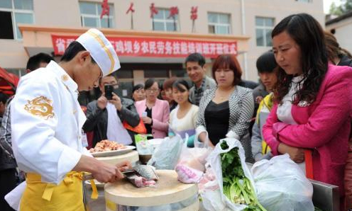 4月9日,甘肃省扶贫“牵手工程”农民工技能培训“大篷车”的技能培训老师正在对农民工进行烹饪技能培训。 杨艳敏 摄