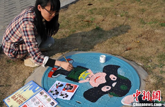 4月9日,合肥工业大学艺术学院的学生们用手中的画笔,为平凡的小井盖“添春装”。中新社发 韩苏原 摄