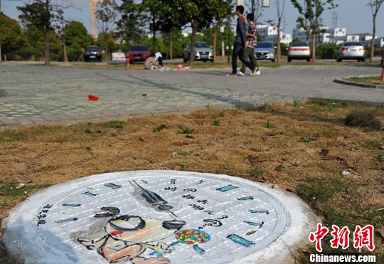 4月9日,合肥工业大学艺术学院的学生们用手中的画笔,为平凡的小井盖“添春装”。中新社发 韩苏原 摄