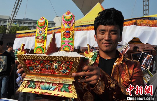 4月9日,藏族学生展示从家乡带来的切玛。切玛是藏族一种象征吉祥类的东西,藏历新年时使用。中新社发 韩苏原 摄