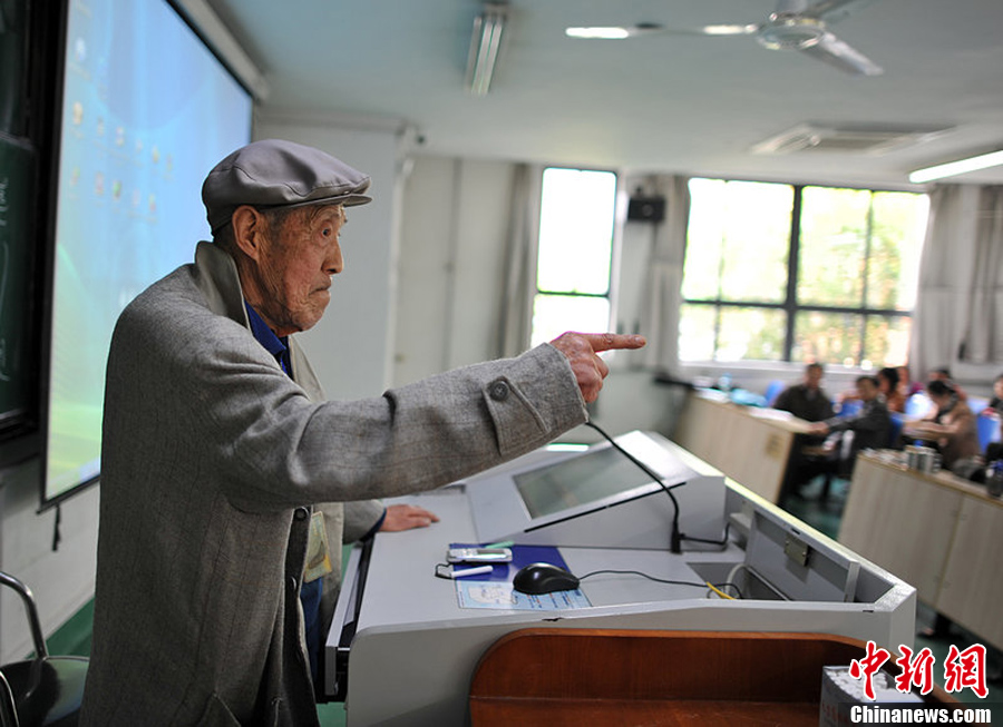 4月9日安徽省合肥市,中国科技大学的课堂上吴天雄老人正在讲台上演讲。卞世鹏 摄