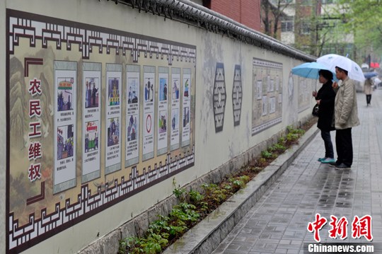 4月10日,山西太原,一座长约200米的“法制墙”亮相街头,内容涉及手机信用卡等当下新型诈骗手法及防范知识,引来过往民众的关注。中新社发 韦亮 摄