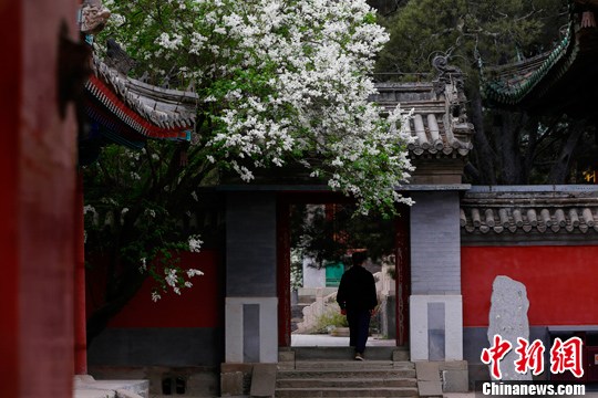 4月10日,民众在北京戒台寺观赏丁香花。中新社发 富田 摄