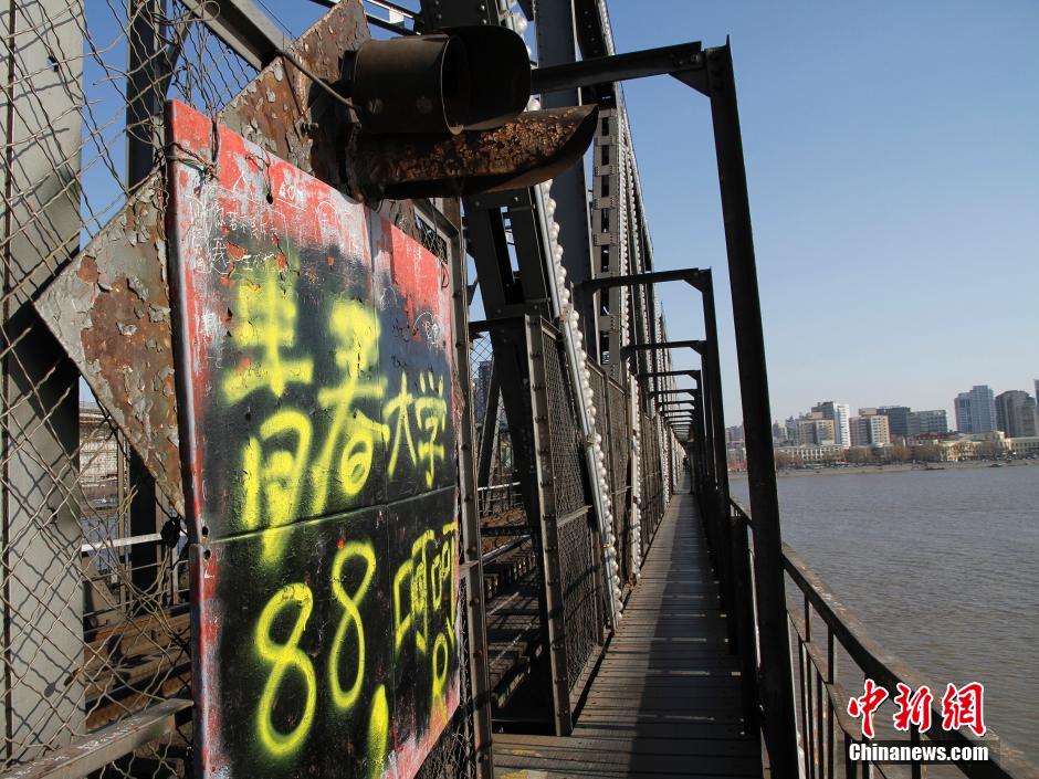 图为松花江铁路桥护栏网上的涂鸦。中新社发 胡迪 摄
