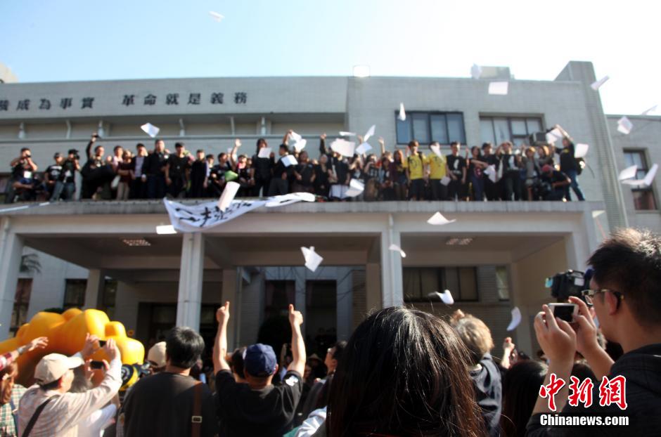 4月10日,以反“两岸服贸协议”为名的台湾学生离开了他们占据24天的“立法院”议场。 当天下午3时半许,一部分原来从架设的铝梯爬上“议场”后门水泥顶棚,再从二楼窗户爬窗进入“议场”的学生,身背随身用品,选择从原路离开,人数约有50人。图为学生在“议场”后门顶棚集结准备撤出。中新社发 陈立宇 摄
