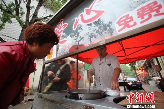 4月10日,山西太原市新民北街的大强家常菜馆门口,厨师正在免费为附近医院的困难患者提供“爱心粥”。这一善举自从2010年5月29日发起,至今已送出近60万碗。中新社发 张云 摄