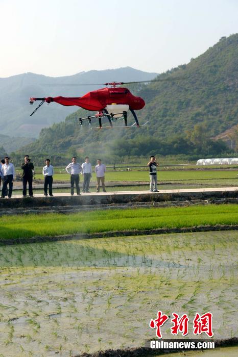 近日,首架农用直升机飞入福建漳州农家,助力春耕。这架喷洒用无人驾驶农用直升机由漳州市漳浦县官浔镇康庄村农民王坤山购置,看起来比普通航模飞机大不了多少,机身下带有一个装喷洒药水用的水箱,螺旋桨和两侧的喷药管均可折叠,方便运输,靠电池和遥控器飞行。图为4月10日,这架农用直升机在农田上空喷药。中新社发 蓝智伟 摄