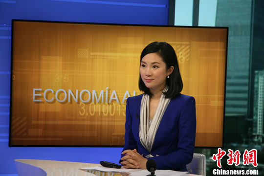4月11日,中央电视台西班牙语国际频道和法语国际频道同时搬迁至央视新址改版播出。图为西班牙语新闻女主播。中新社发 王宇 摄