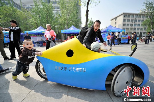 4月12日,孩童在体验天大自主制造的节能竞技赛车。当日,天津大学第二届“海棠季·科普日”科普活动面向市民开放。中新社发 佟郁 摄