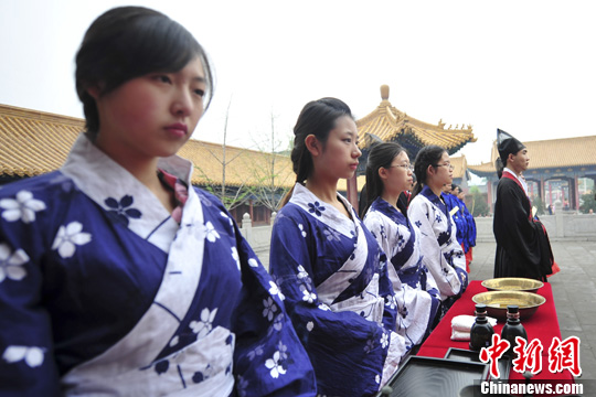 4月12日,济南高校学子祭拜孔子。当日,甲午年春季祭孔大典在济南府学文庙举行。中新社发 张勇 摄