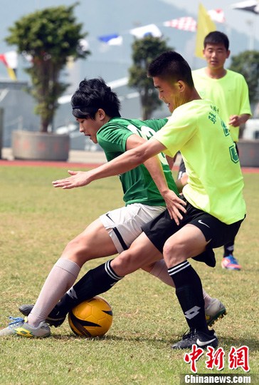 4月12日,解放军驻香港部队官兵与香港大学生(绿衣)在昂船洲海军基地进行足球友谊赛。中新社发 张宇 摄
