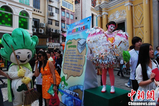 巡游沿途街头有“环保使者”身着废纸或废易拉罐等废品制成的服装宣传环保。中新社发 王国安 摄