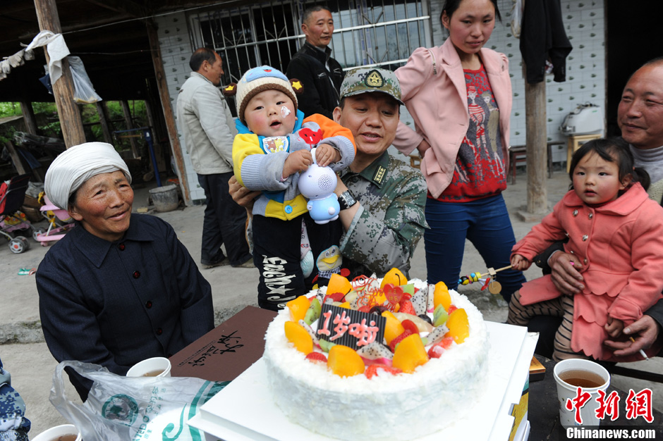 4月12日,“4·20”芦山地震一周年纪念日前夕,芦山县太平镇三名“地震宝宝”即将迎来一周岁的生日。当日,成都军区某分部官兵在太平镇依次看望了在地震后出生的这三名“地震宝宝”,为这三名孩子送去儿童用品、食物、早教机、生日蛋糕等,提前送去生日的祝福。图为成都军区某分部政委姚榕看望“地震宝宝”马睿军,一年前,姚榕带领的医疗队帮助了马睿军顺利出生。中新社发 张浪 摄