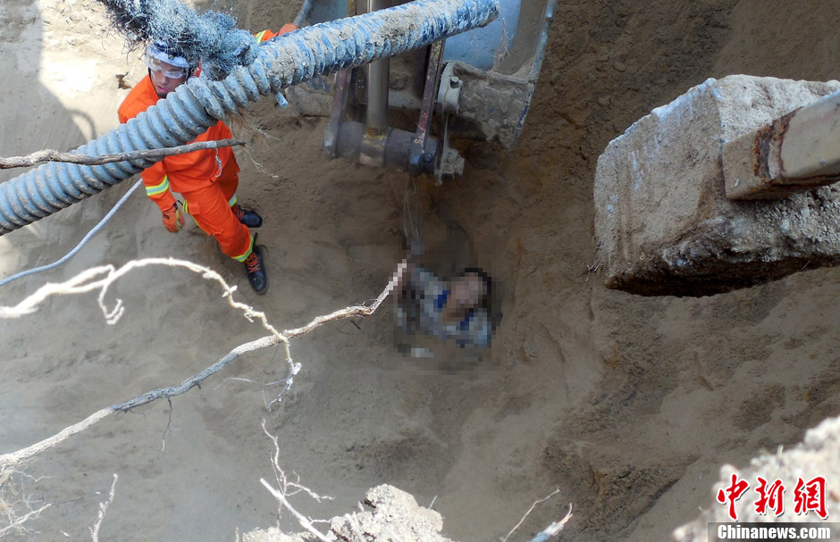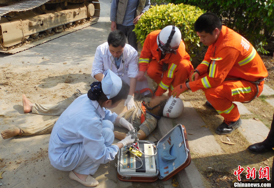 4月13日13时40分,福州市闽侯县上街橘园洲大桥桥头北侧大洋鹭洲别墅区内,一名工人在进行挖坑作业时,因坑内土方突然发生坍塌而被掩埋,不幸遇难。目前,相关部门已经介入事故原因调查。图为经过10多分钟徒手挖掘,被埋工人的上半身露了出来。中新社发 黄绿荣 摄