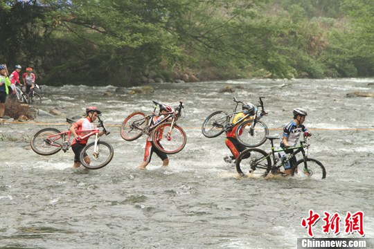 “2014井冈山国际山地自行车挑战赛”在风景秀美的井冈山黄坳乡国际山地赛道举行。本次挑战赛分为女子组、男子大龄组、男子普通组、男子公开组,共吸引350多名运动员参赛。赛道全长约5.8公里,其中一段长几十米的水上赛道让不少选手大呼刺激,许多选手选择扛起自行车通过。姜涛 摄