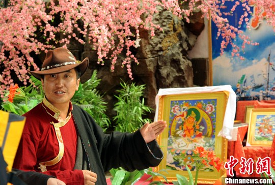 4月13日,位于青海省同德县的玛多县黄河源生态移民新村负责人洛桑扎西,向来访者展示推介该移民新村村民制作的藏族手工艺品掐丝唐卡。他希望移民新村在发展传统的畜牧业的同时,传承弘扬藏族唐卡艺术,为解决村民就业、增加收入服务。中新社发 孙自法 摄