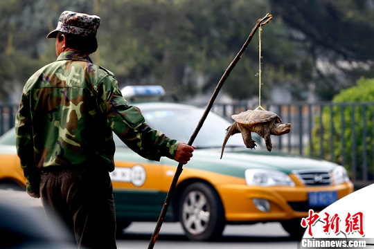 4月14日,一男子在北京三元桥匝道处向来往行人和车辆兜售鳄龟。中新社发 富田 摄