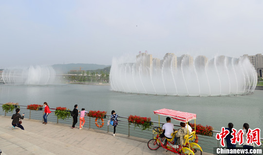 4月13日,长沙梅溪湖音乐喷泉对游客开放。规模宏大的音乐喷泉蜿蜒至100余米,吸引了众多游客前来观赏喷泉盛况。中新社发 杨华峰 摄