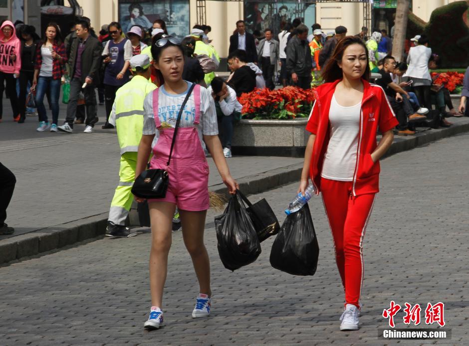 4月14日,哈尔滨中央大街上很多游客穿着夏天的服装,仿佛入夏一般。据统计,当日市区气温将达到25摄氏度,刷新开年最高气温的纪录。中新社发 胡迪 摄