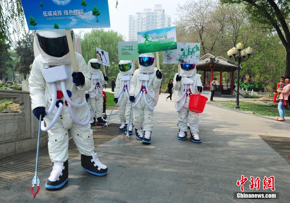 4月14日,在河北石家庄一公园,一支由“太空人”组成的环卫队正在清理地上的各种垃圾。据了解,这些身着耐高温、抗辐射特殊“太空服”的市民,是在进行一场环保行为秀,活动主题为“没有未来的未来”。他们选择身穿太空服,就是为了提醒人们如果环境继续受到污染,那在未来我们就要每天过着身穿太空服、靠氧气瓶呼吸的日子。中新社发 翟羽佳 摄