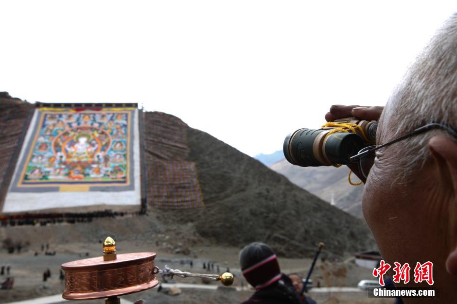 图为一名藏族老人用望远镜远观大佛。中新社发 胡贵龙 摄