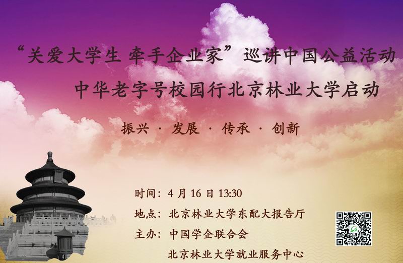 “关爱大学生 牵手企业家”巡讲中国——中华老字号校园行活动启动仪式将于4月16日在北京林业大学举行。