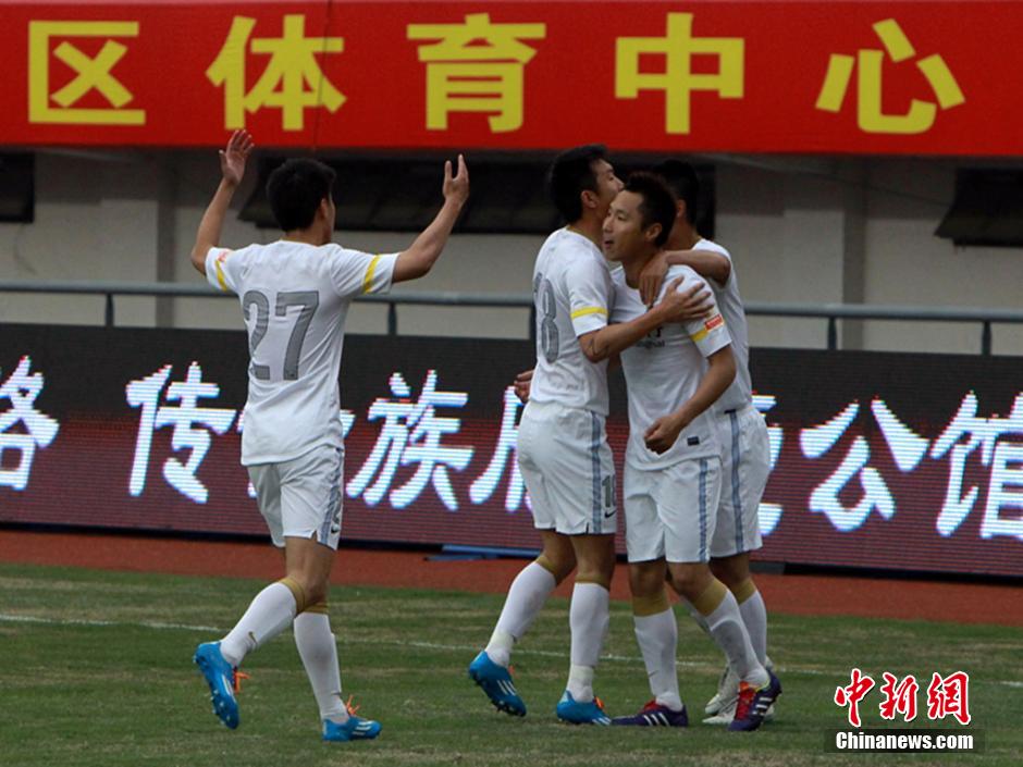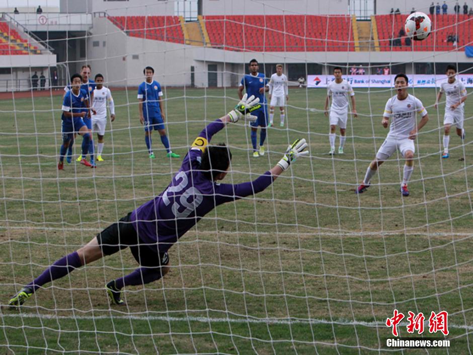 4月13日晚, 在2014赛季中国足球协会超级联赛第六轮比赛中,上海申鑫队在上海金山体育中心,凭借王赟点球,主场以1比0战胜哈尔滨毅腾队,获得主场首胜,而哈尔滨毅腾队连败创中超纪录。庄毅 摄