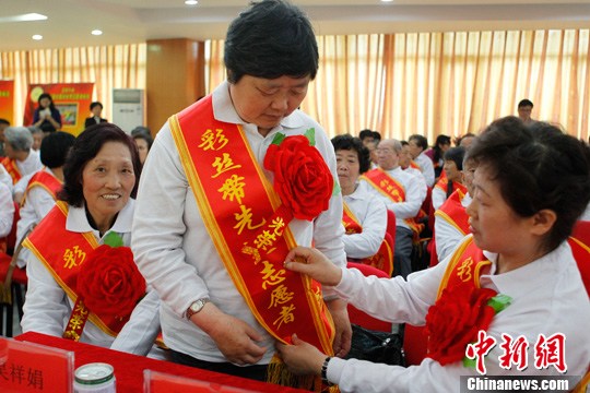 4月15日,抗癌成功后又帮助他人战胜病魔的抗癌彩丝带志愿者在北京接受表彰,戴上了大红花。当日,第四届全国彩丝带志愿者表彰暨防止肿瘤复发转移新成果报告会在北京举行。来自全国的120名康复的彩丝带志愿者被评为先进,并树立了十大标兵。中新社发 苏丹 摄