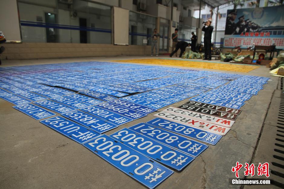 4月15日,广西南宁巡警支队披露,警方近期捣毁两处制造假冒机动车号牌的黑窝点,查获包括假军、警车牌在内的2千多副牌照,缴获制作设备一批,抓获犯罪嫌疑人1人。疑犯称,该制售窝点生意已经涉及全国多地。图为警方展出缴获的假牌。劳运荣 摄