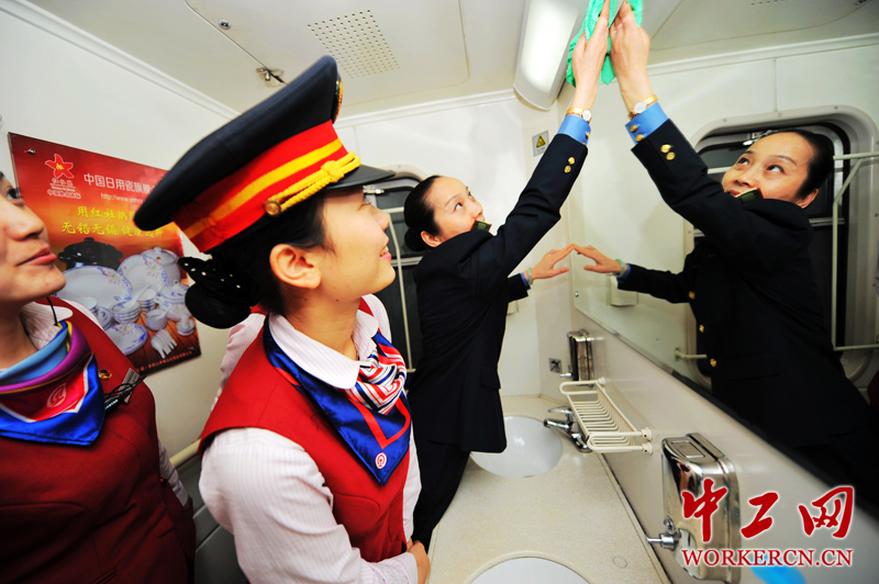 图为刘金娣在南昌至北京的Z68次列车上,言传身教细心辅导乘务员们做好服务旅客工作。