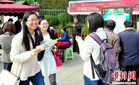 4月16日,游客背诵“李清照诗词”获免费游趵突泉门票。当日,在济南“天下第一泉”景区推出的“背李清照诗词,免费游趵突泉”活动现场,百名游客完整背诵“李清照诗词”一首,喜获免费游趵突泉门票。中新社发 张勇 摄